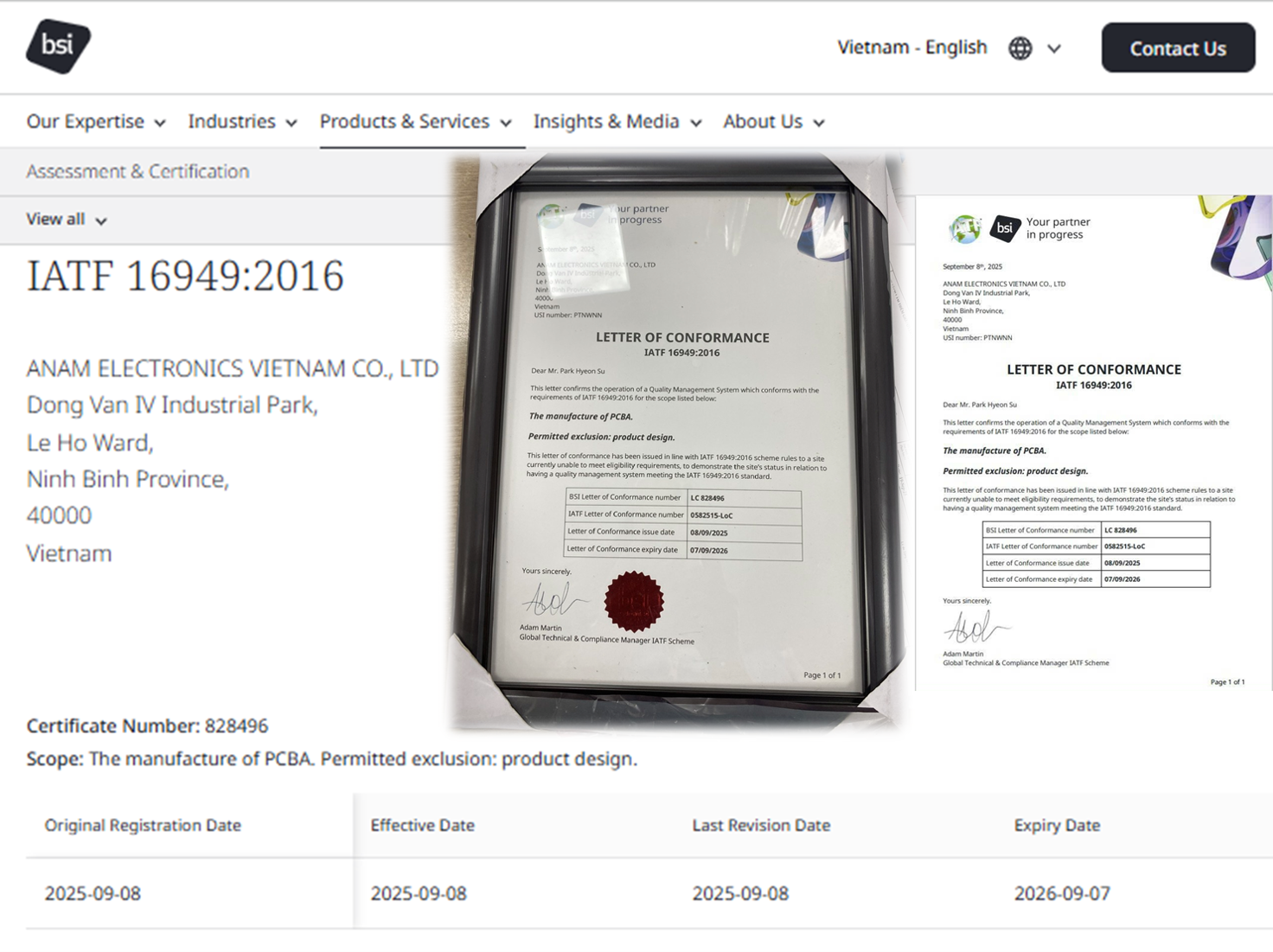 Hình 4 | Thư chứng nhận hệ thống quản lý chất lượng ngành ô tô theo tiêu chuẩn IATF 16949:2016 của BSI cấp cho Anam Electronics Vietnam Co., Ltd (bấm vào ảnh để đến link đến thư chứng nhận trên website của BSI)